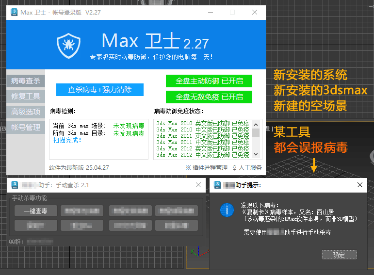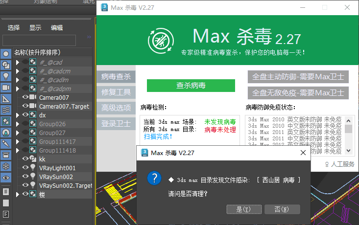 1、西山居病毒是非常旧且非常普通的病毒,中毒后表现就是复制模型会非常卡,除此之外,没有其它的症状,Max杀毒卫士早已具备检测并清除此病毒的能力,所以不存在检测不出的情况。以下是真正有病毒时,3dsmax自带的安全工具和Max杀毒卫士同时检测出西山居病毒的情况: